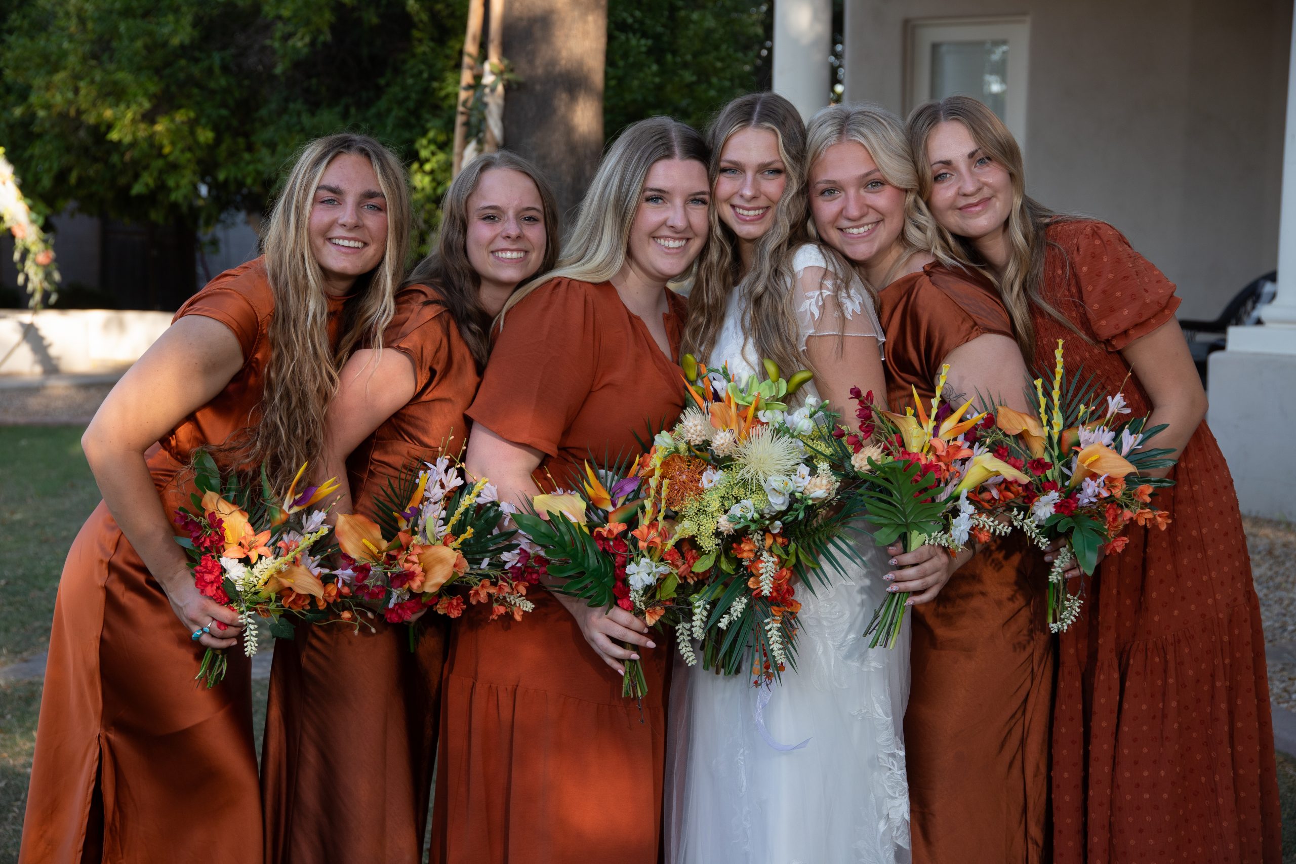 Bride with bridesmaids at the Gilbert Temple.  Wedding photos at the Gilbert AZ Temlpe.